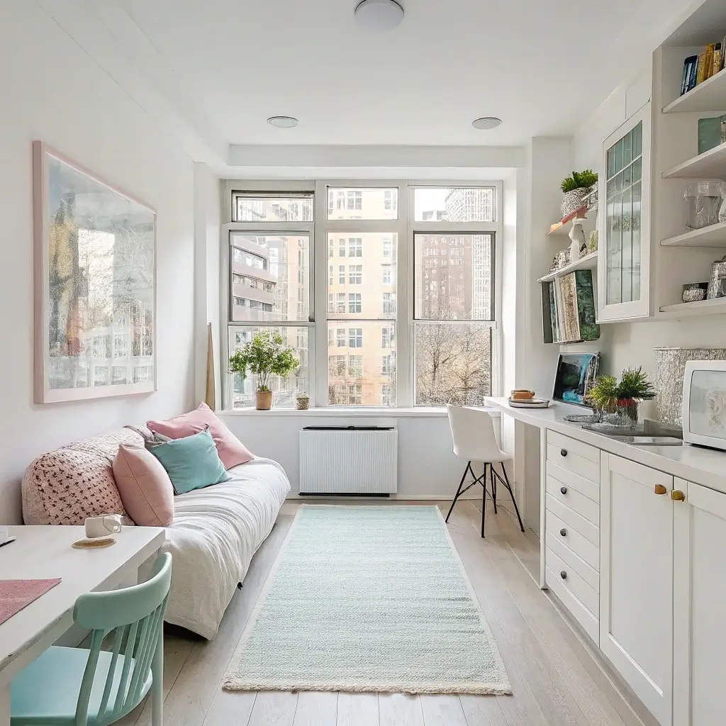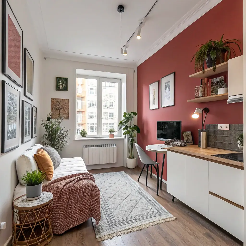 The magic formula I’ve found? 80% light neutrals, 20% personality. This gives you the spacious feeling while keeping things interesting. My studio has soft gray walls with pops of sage green and terracotta – it feels twice its actual size but still has character.