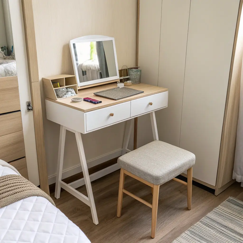 Sometimes the classics are classic for a reason. A vanity with pull-out drawers remains one of the most practical solutions for small bedroom organization.