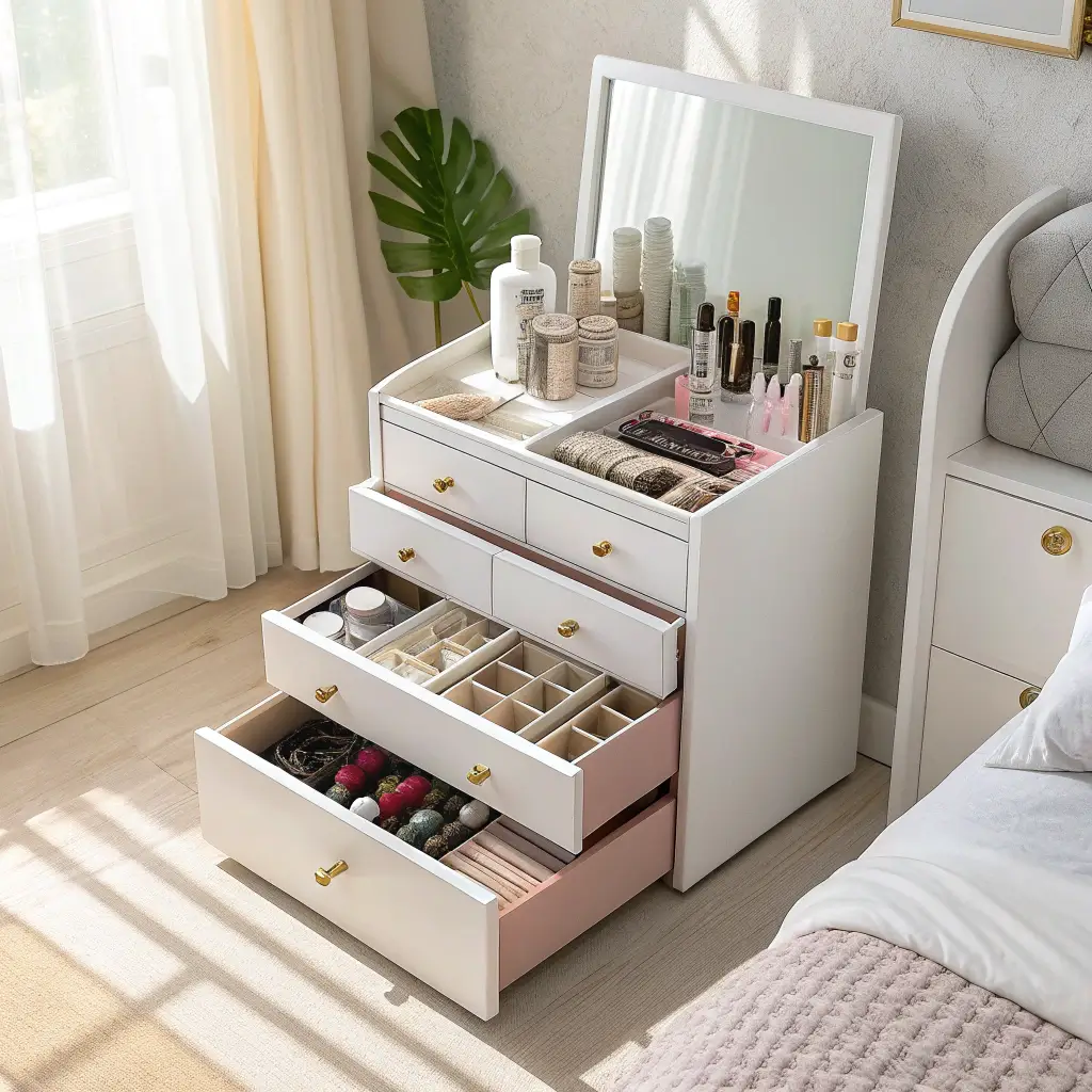The key for small spaces is choosing a vanity where the drawers are designed for specific purposes—think dedicated slots for lipsticks, divided sections for palettes, and lined compartments for jewelry.