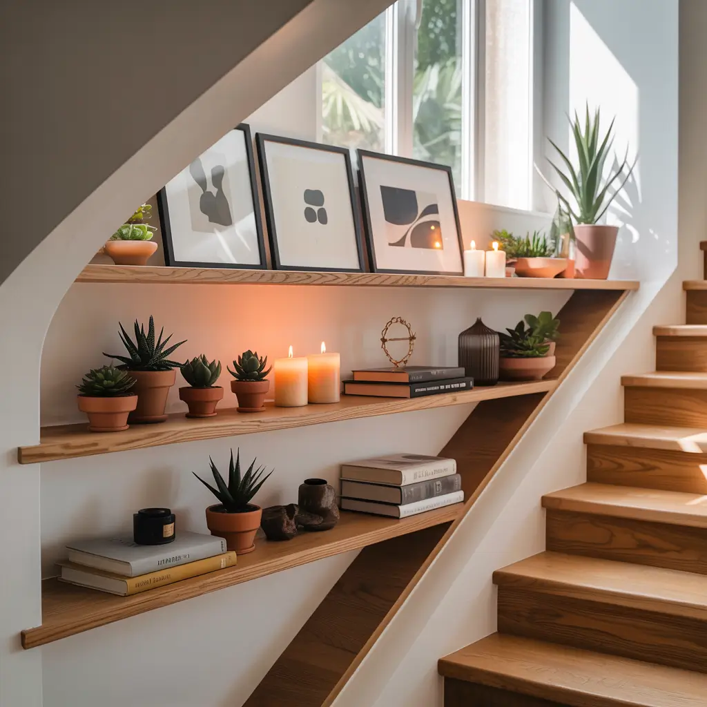 I installed staggered floating shelves at different heights along the staircase wall. Each shelf holds a rotating mix of small plants, framed photos, and decorative objects. The best part? I can switch things up seasonally without putting new holes in the wall. Spring means more plants, winter brings candles and cozy touches.
