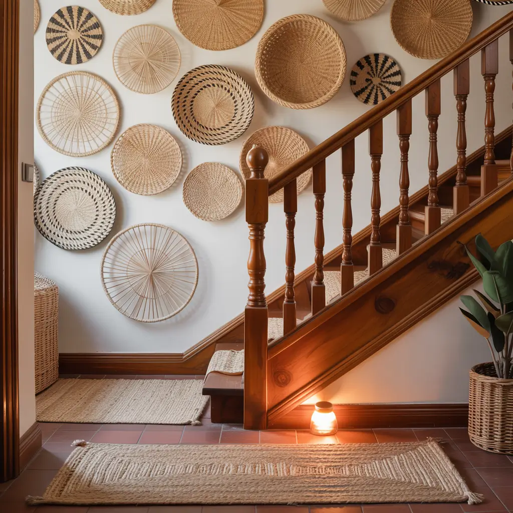 Let’s talk mounting – because nobody wants baskets crashing down mid-stair climb. I use a combination of picture hooks for lighter baskets and wall anchors for heavier ones. The trick is tilting baskets slightly forward so they don’t look flat against the wall. Add some air plants or dried flowers to a few baskets for extra bohemian vibes. Just maybe skip this in earthquake-prone areas :/
