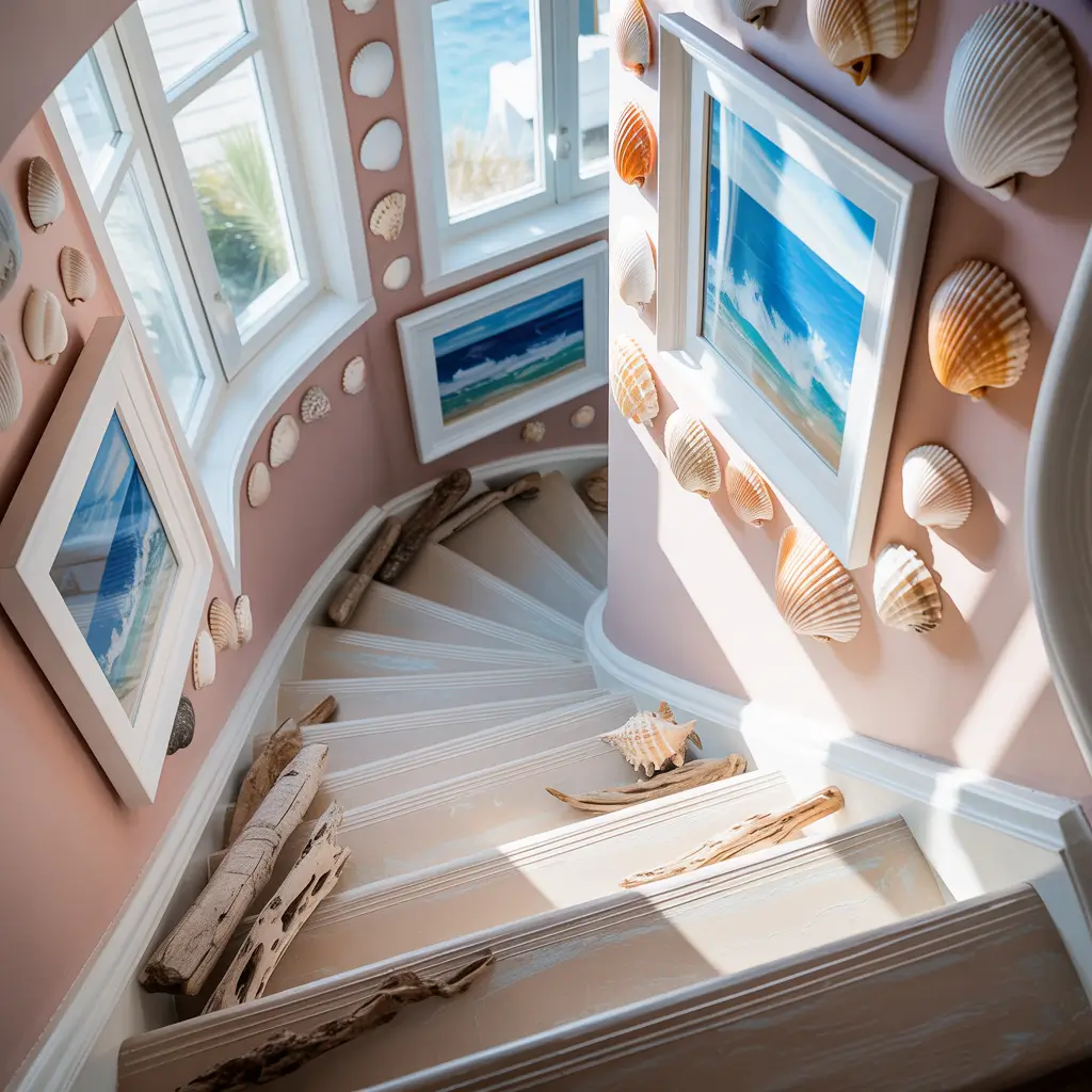 The difference between coastal and “beach gift shop” comes down to restraint. I include maybe one or two literal ocean elements – a beautiful shell or piece of coral – among abstract pieces. Quality matters more than quantity. One stunning piece of driftwood art beats ten plastic starfish every time. Your staircase should whisper “beach house,” not scream “seafood restaurant!”