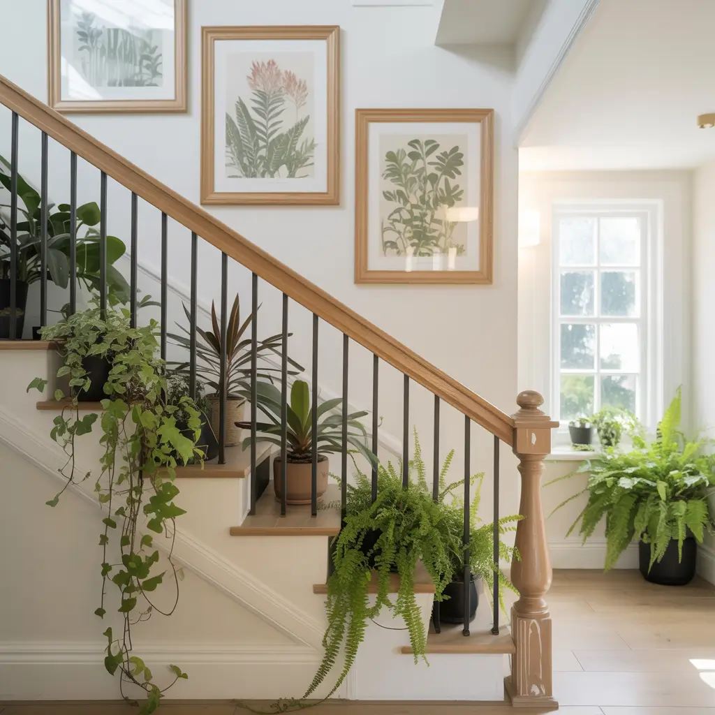 The secret to botanical galleries is variety. Mix leaves with flowers, include some scientific diagrams with artistic interpretations. I arranged mine asymmetrically, clustering some while leaving others to breathe. The organic shapes of plants naturally soften the angular staircase architecture. Best part? This garden thrives in any light condition!
