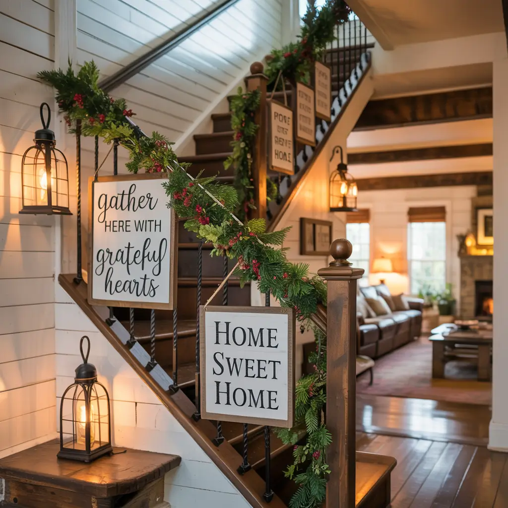 Here’s how to keep farmhouse fresh: pair rustic elements with clean lines. My vintage signs hang in modern frames. Lanterns are sleek black metal, not distressed white. This blend prevents your staircase from looking like a country store exploded. It’s farmhouse style for people who live in this century!
