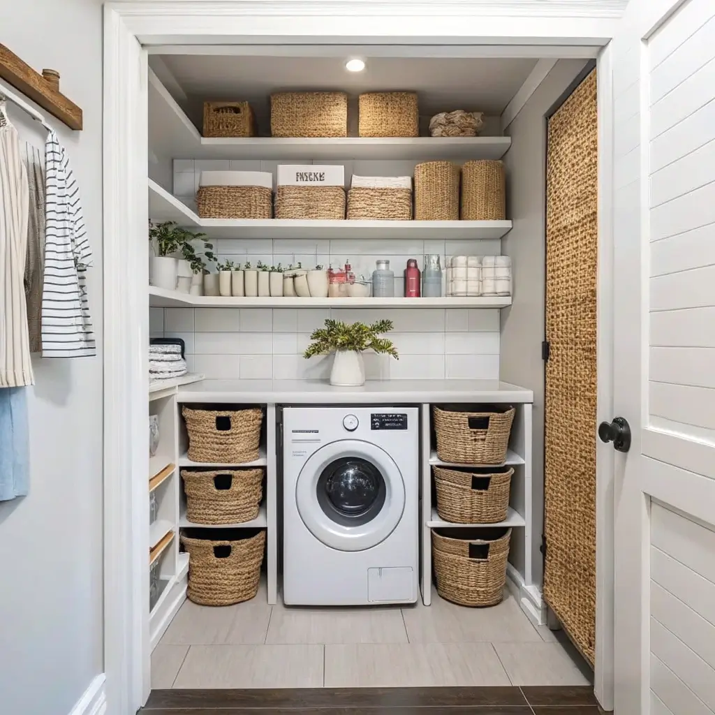 Open shelving might seem counterintuitive in a small space, but hear me out. When paired with coordinating baskets, open shelves keep everything accessible while looking neat and intentional. No more digging through dark cabinets trying to find that one specific stain remover.