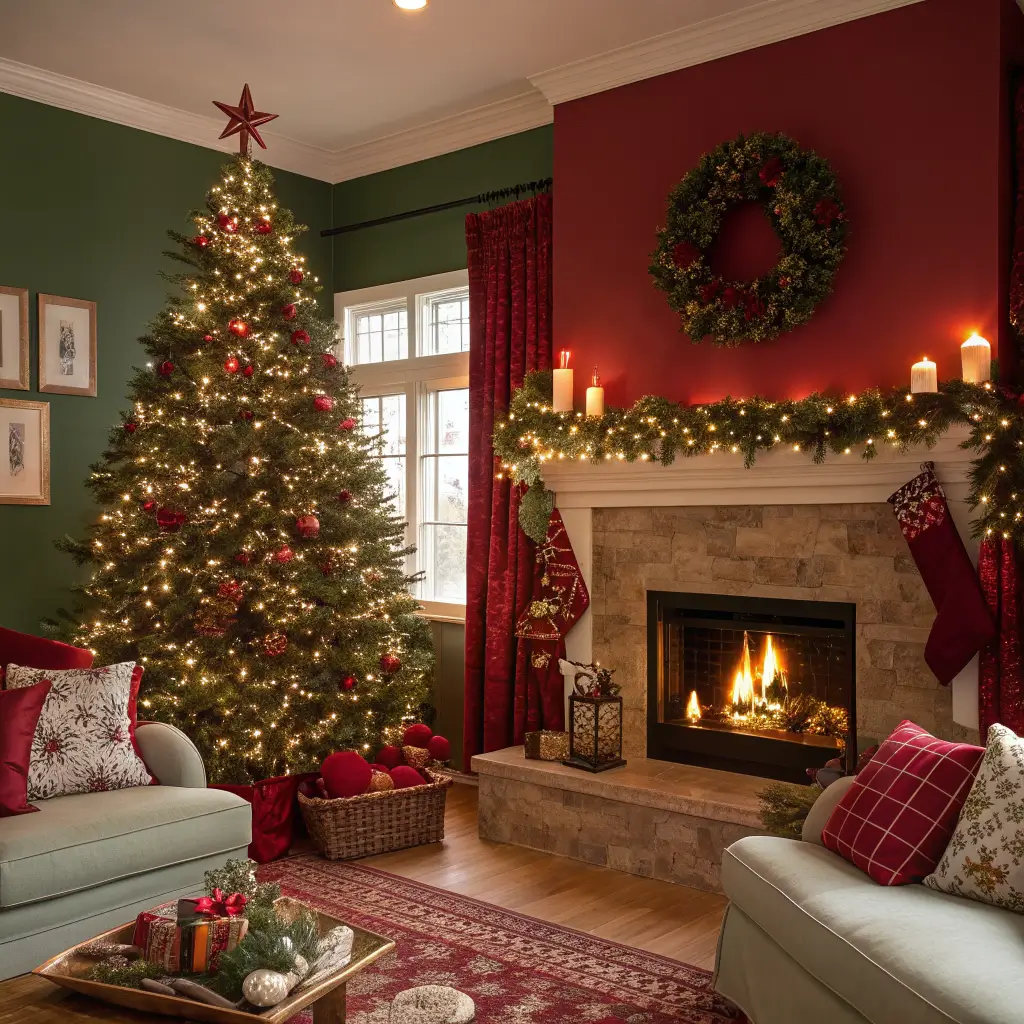 Start with a neutral base – your existing sofa and walls work perfectly. Then layer in red through throw pillows, cozy blankets, and maybe a gorgeous area rug. I personally love adding forest green through real or quality faux garland draped along the mantelpiece and around doorways.