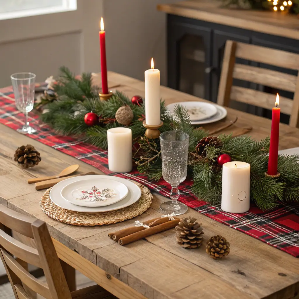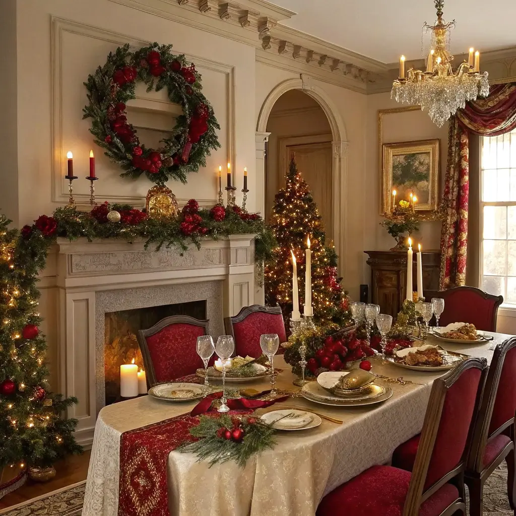 Red roses mixed with gold-painted branches create stunning centerpieces. Add crystal glasses catching candlelight, and suddenly your dining room rivals any fancy restaurant’s holiday setup.