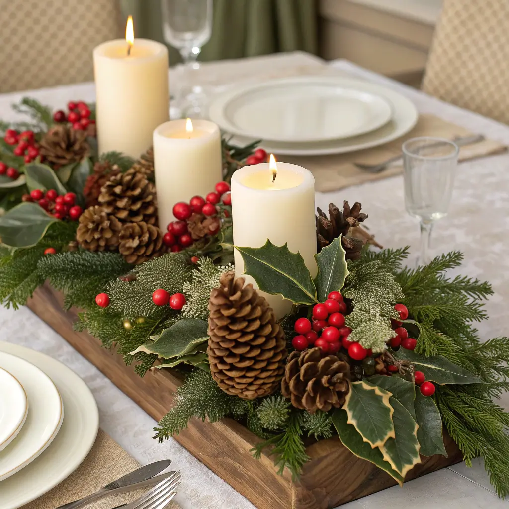 Nature provides the best decorating materials, and pinecone and holly centerpieces prove this perfectly. They cost almost nothing if you forage them yourself, yet look like something from a high-end catalog.