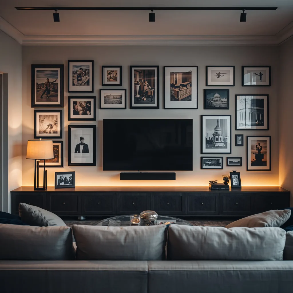 I helped my sister set up her gallery wall last summer, and we discovered the secret sauce: treat your TV like the largest piece in the collection. Start with the TV as your anchor point, then build outward with varying frame sizes and styles.