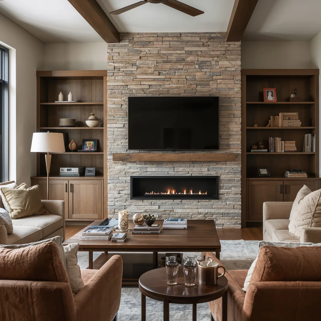 Nothing says “I have my life together” quite like a wood-paneled accent wall behind your TV. Whether you go for reclaimed barn wood or sleek walnut panels, this approach adds instant warmth and texture to any room.