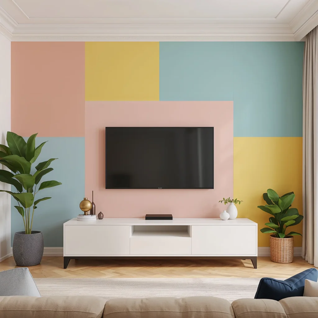Why settle for one paint color when you can have several? Color-blocking creates a bold, artistic backdrop that turns your TV wall into a statement piece. Think Mondrian meets modern living room.
