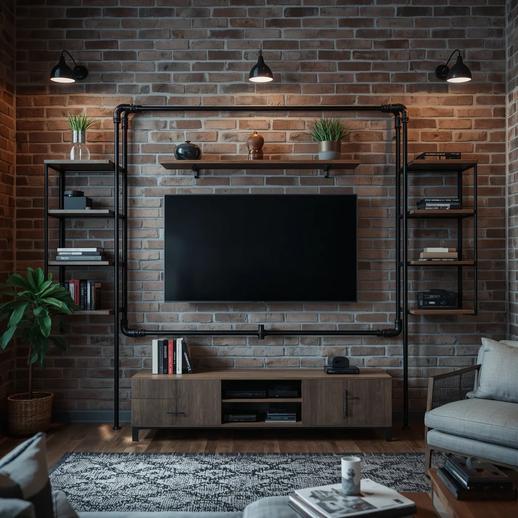 Channel your inner urban loft dweller with industrial pipe shelving around your TV. This DIY-friendly option adds character and functionality while making you look like you know your way around a hardware store (even if you don’t).