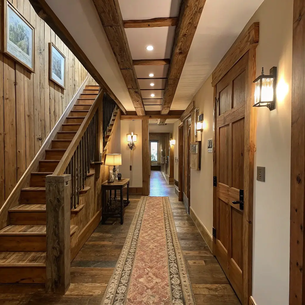 Bringing rustic wood elements into your upstairs hallway adds instant warmth and character. We’re talking reclaimed wood accent walls, barnwood picture frames, or exposed ceiling beams if you’re feeling ambitious.