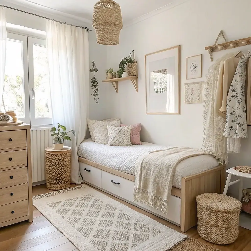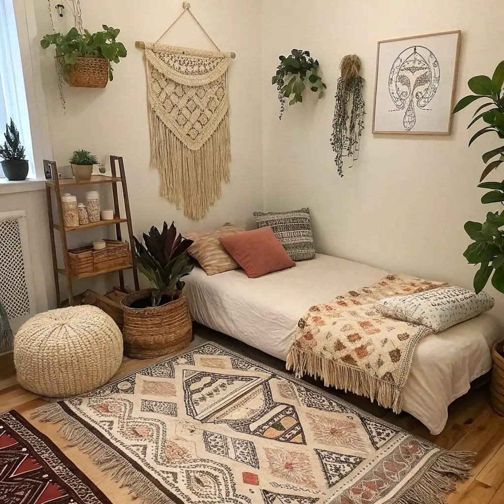My boho bedroom features macramé wall hangings (zero floor space needed), plants hanging from the ceiling, and a tapestry behind my bed instead of a traditional headboard. The key is choosing pieces that add personality without adding clutter.