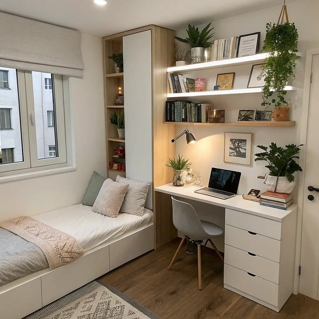 Corners are the most underutilized space in bedrooms. A corner desk with built-in shelving turns dead space into a productivity powerhouse.