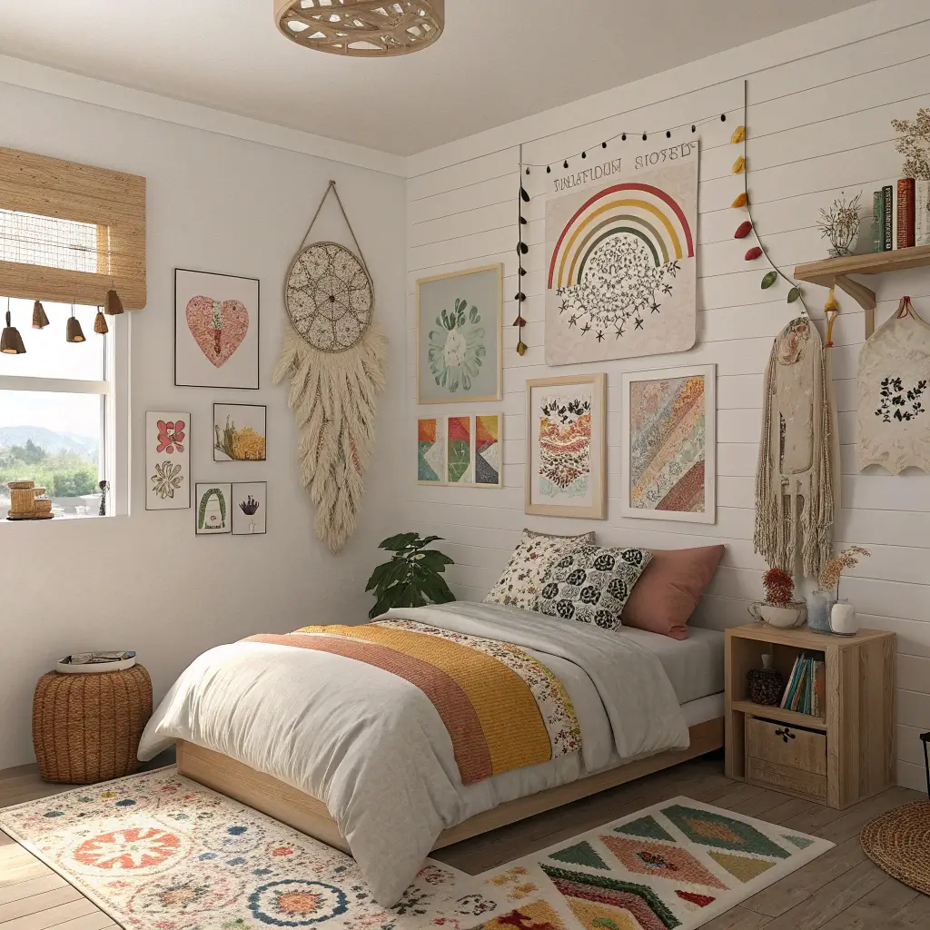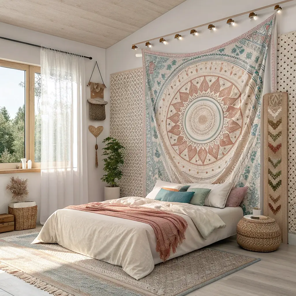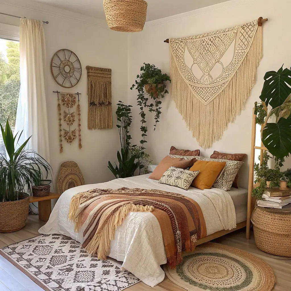 Boho style brings that relaxed, traveled-the-world vibe without actually needing a passport. Macramé wall hangings, woven tapestries, and dreamcatchers create texture and visual interest that paint alone can’t achieve.