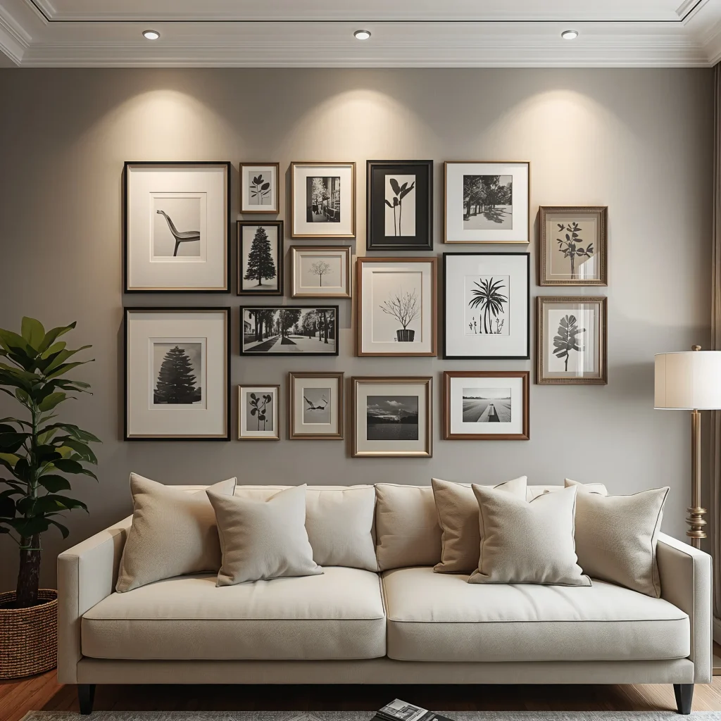 Let’s kick things off with the classic gallery wall – except we’re throwing the rulebook out the window. Who says all your frames need to match? That’s boring, and frankly, it screams “I bought this set at Target.”