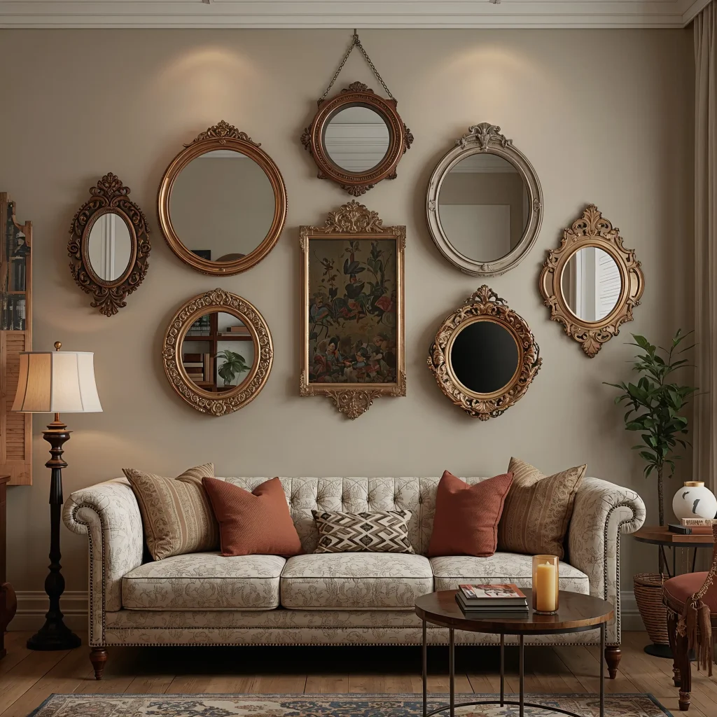 Mirrors aren’t just for checking if you have spinach in your teeth. A curated collection of vintage mirrors creates depth, reflects light, and makes your space feel twice as big.