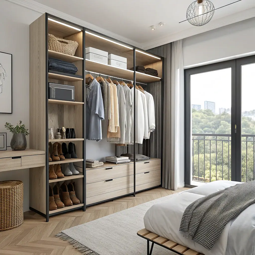 Open wardrobes create an airy feel that closed wardrobes can’t match. They make your room feel larger and force you to stay organized. Consider it built-in motivation for keeping your space tidy.