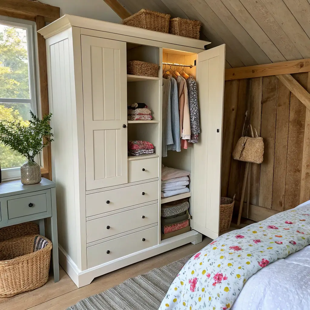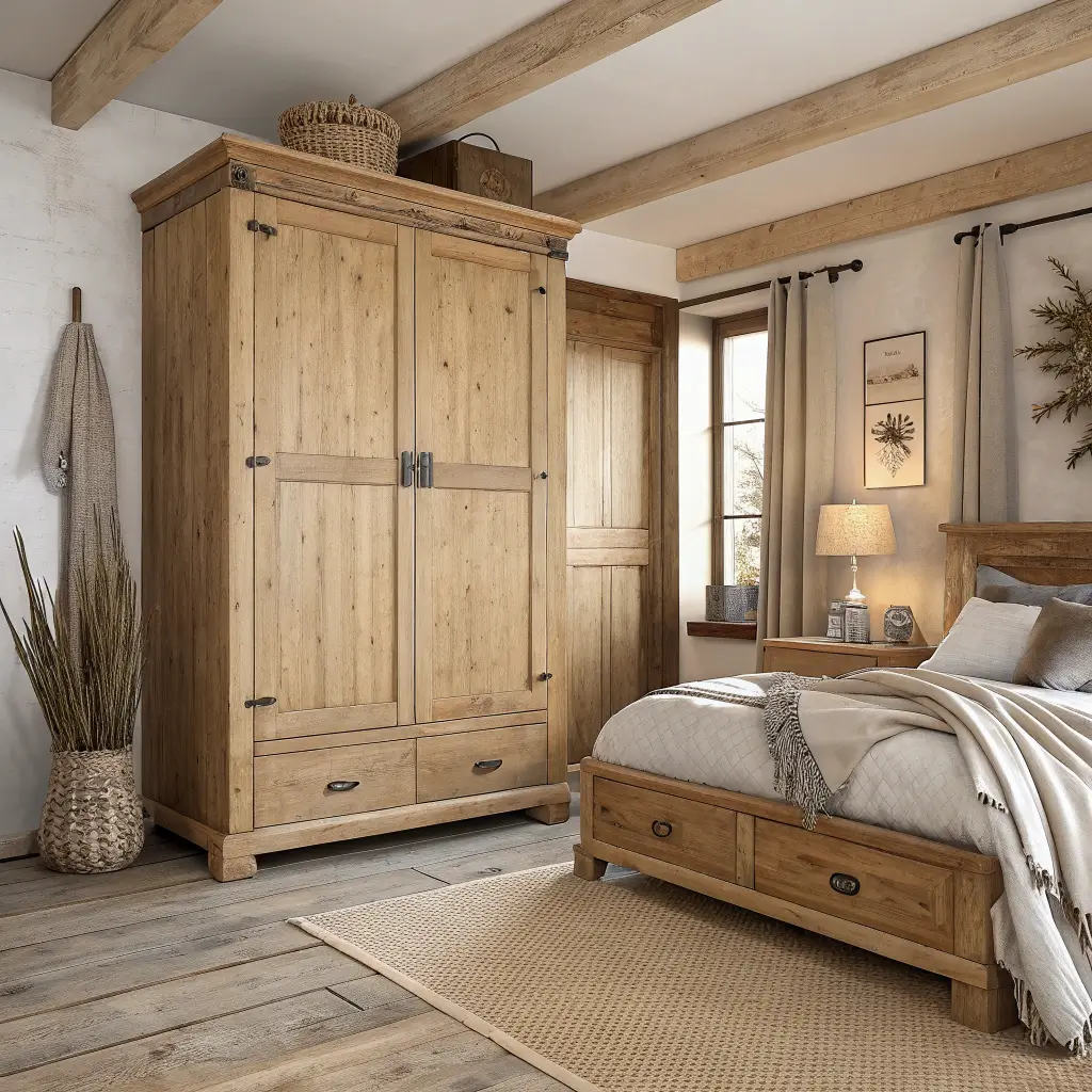 Mix rustic wooden wardrobes with modern elements for an updated farmhouse look. Industrial handles on barn-door style wardrobes? Chef’s kiss. The contrast keeps things interesting and prevents your room from looking like a time capsule.