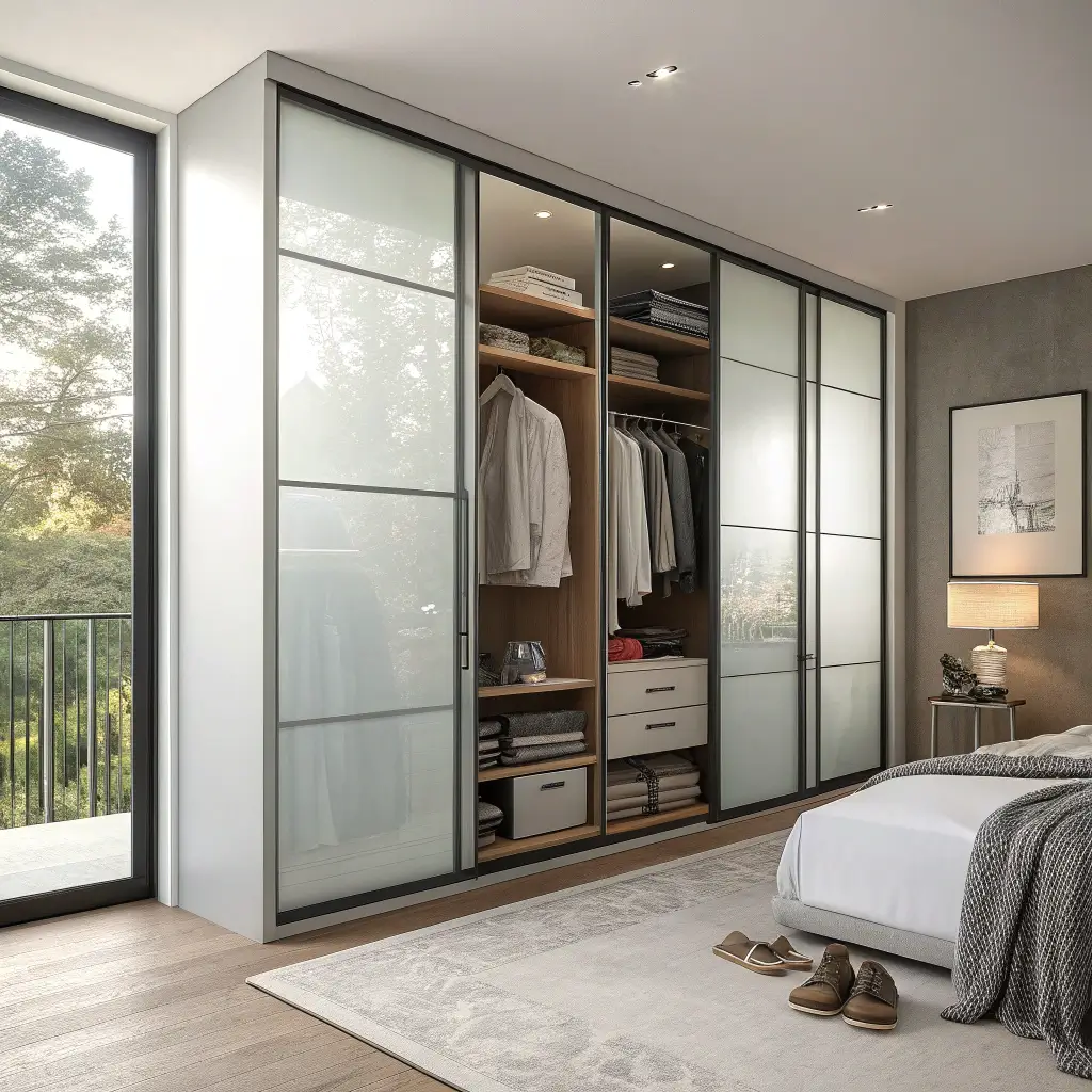 Contemporary glass wardrobes often feature sleek metal frames that add industrial chic to your bedroom. The combination of materials prevents the design from feeling too cold or clinical. Add some warm lighting inside, and you’ve got yourself a fashion showcase.