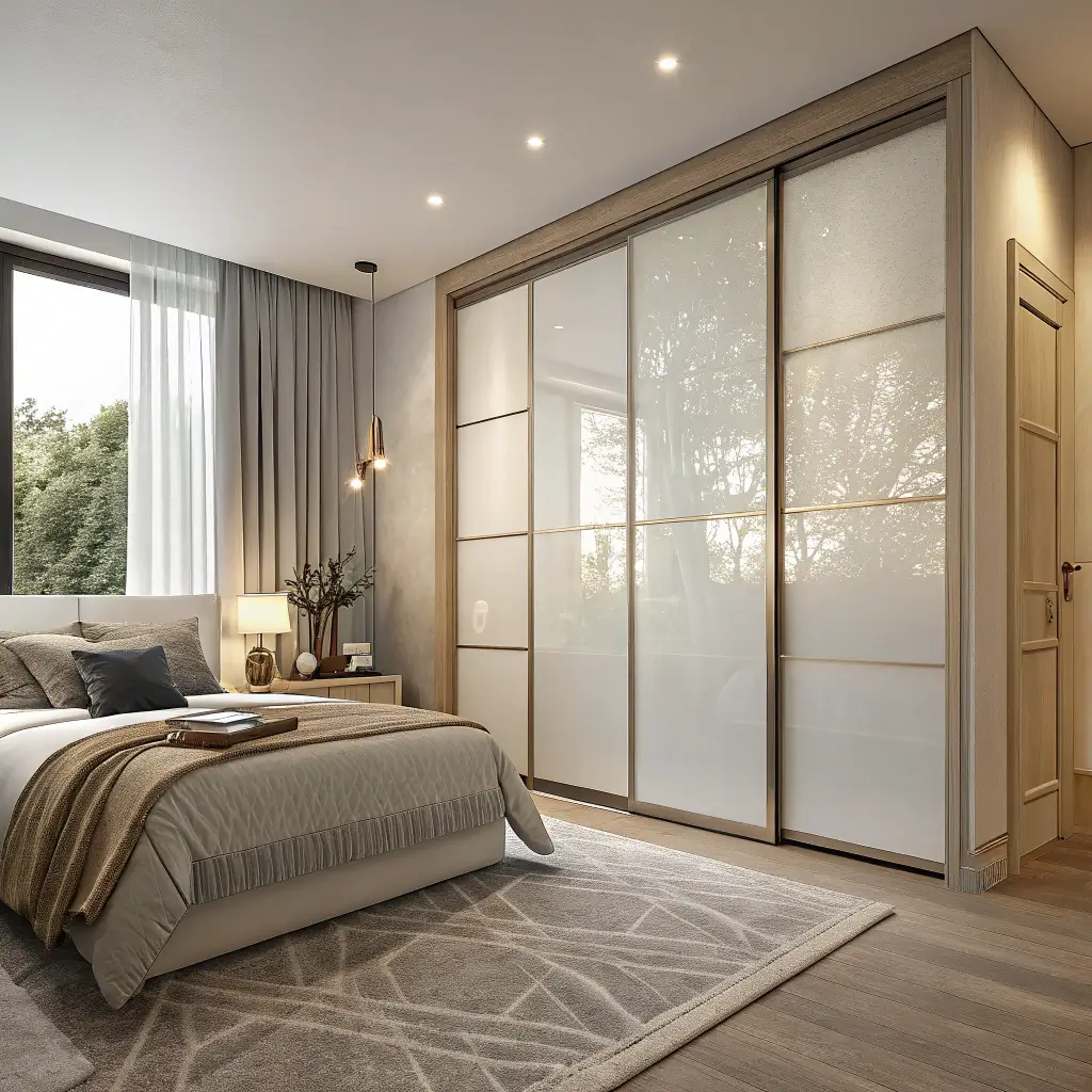Frosted glass sliding doors strike that perfect balance between privacy and openness. They let light filter through while keeping your messy Monday morning wardrobe situation under wraps. It’s like having Instagram’s blur tool for your bedroom storage.