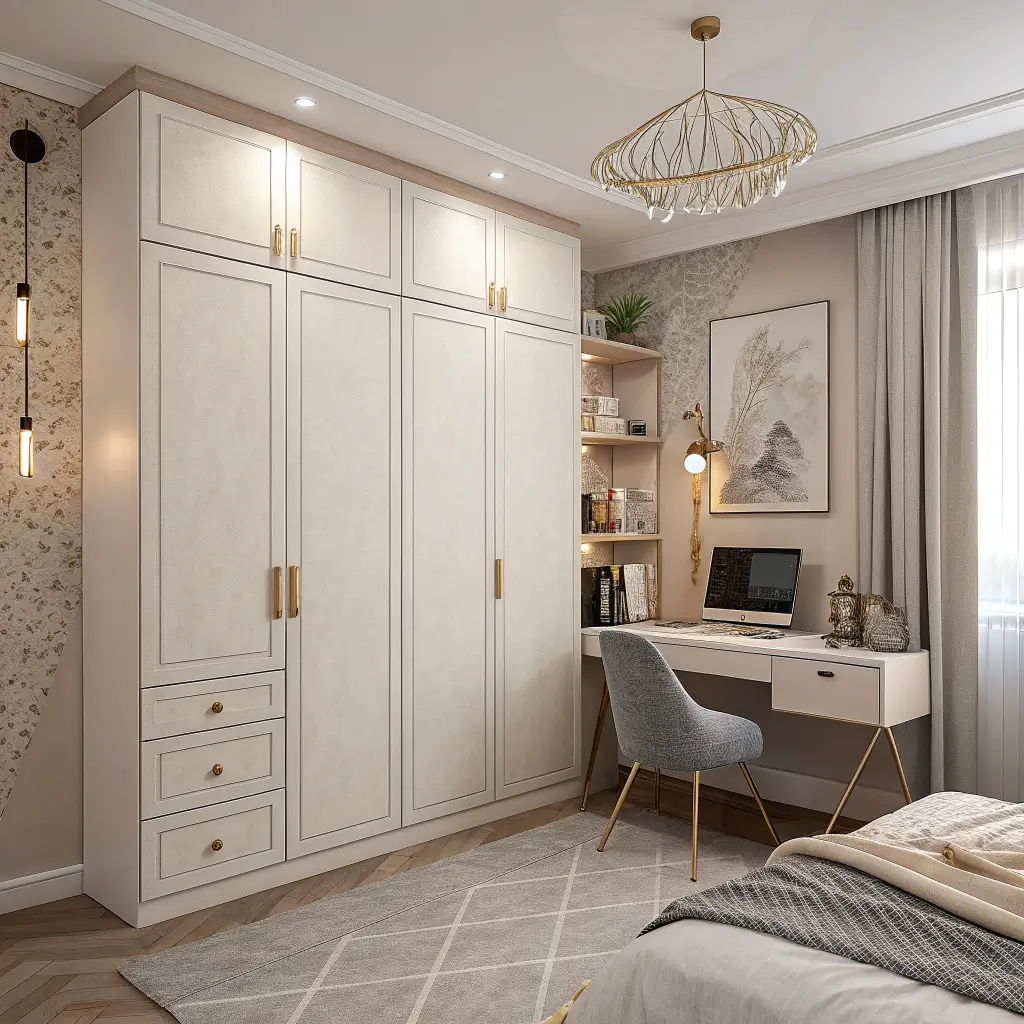 The desk portion typically slides out or folds down from the wardrobe body. Some designs incorporate a floating desk appearance by mounting the work surface on invisible brackets. This creates an airy feel even though everything’s connected.