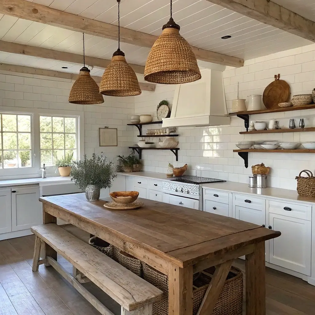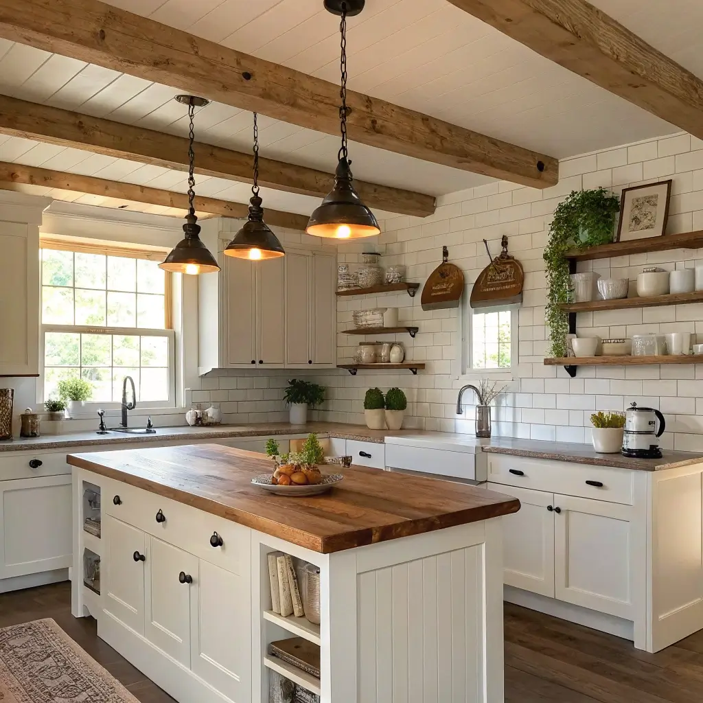 Now, if minimalism feels a bit too stark for your taste, let’s swing to the completely opposite end of the spectrum. Farmhouse white kitchens bring warmth, character, and that “come sit down and have some pie” energy that makes everyone feel welcome.