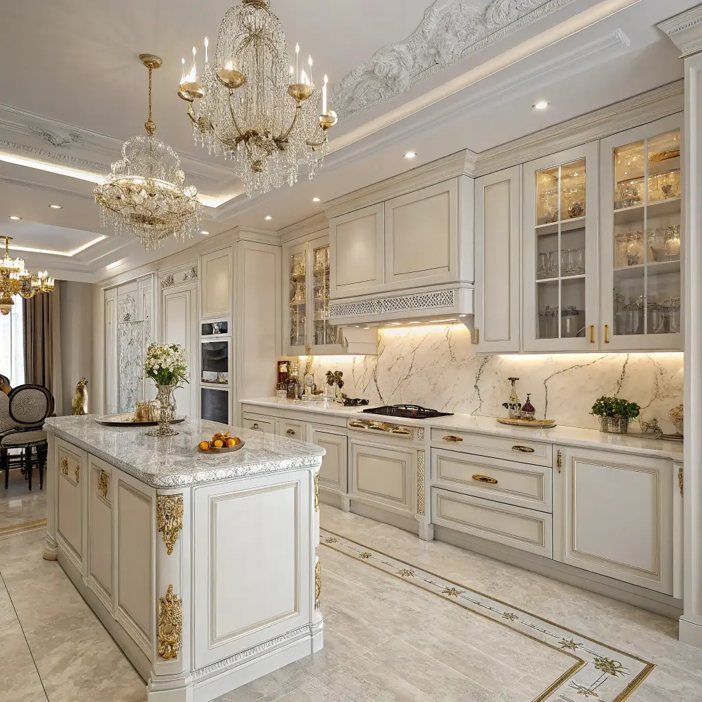Now we’re entering dream kitchen territory. Nothing says luxury quite like white marble countertops gleaming under carefully designed lighting. It’s the kind of kitchen that makes you want to throw dinner parties and pretend you know how to make beef bourguignon.