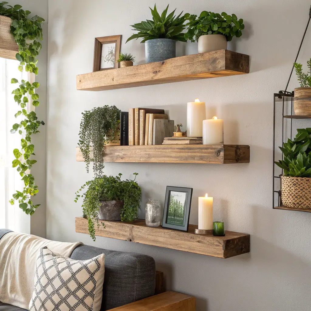 Can we just acknowledge that floating shelves are the MVPs of small space living? They give you storage without eating up floor space, and when done right, they’re art pieces themselves.